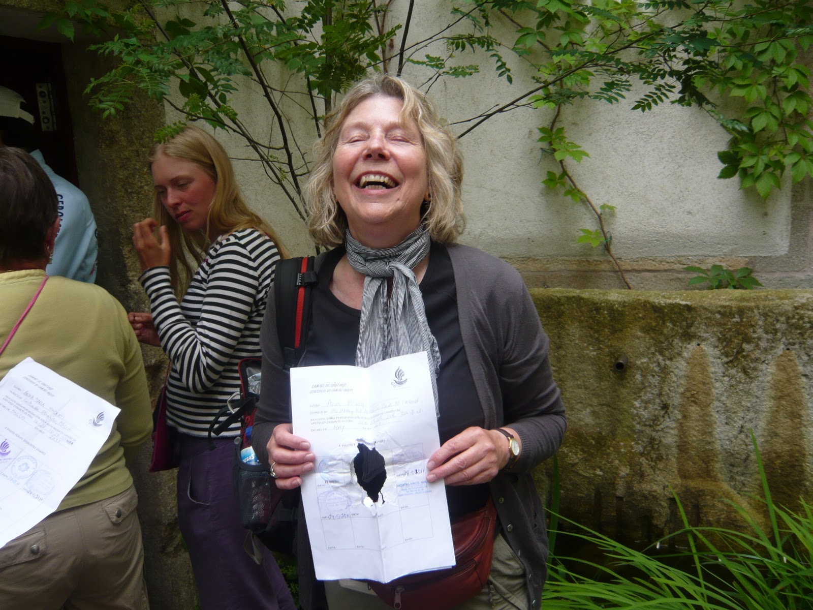 Day 5 In Santiago de Compostella. At the Pilgrim office, in the shadow of the Cathedral, penetrating questions are asked. I held my breath, but we had done it! We had accomplished 80 miles. That is enough to achieve a certificate scribed in Latin to the effect.